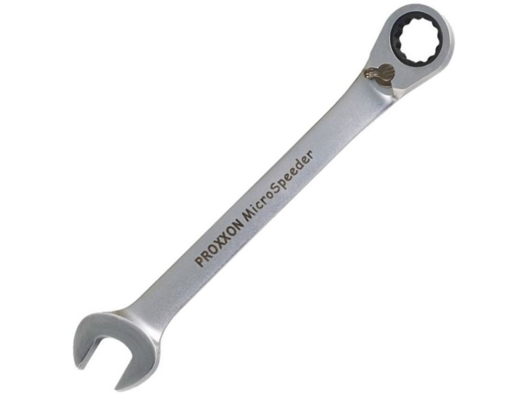 PROXXON MICRO -72 zubový očko-vidlicový račňový kľúč je vybavený prepínaním L / P.Je o 15 ° vyhnutý a vhodný pre prácu na rovinných plocháchJednoduché nasadenie kľúča.Špeciálny tvar vnútorného krúžku kľúče zamedzuje zosunutia kľúča z matice.