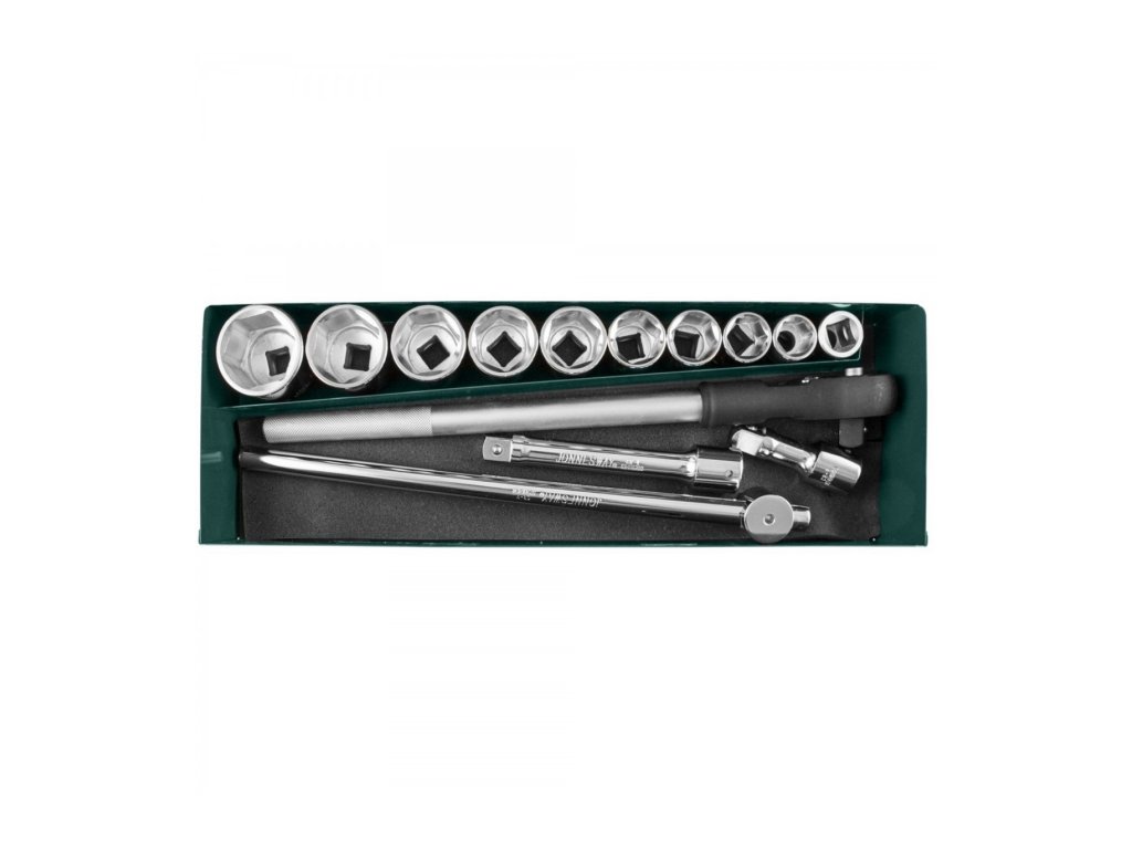 Parametre:Materiál: Vysoko kvalitná chróm-vanádiová oceľ (Cr-V)Materiál račňa: rukoväť chróm.vanádiová oceľ (Cr-V), mechanizmus chróm-molybdénová oceľ (Cr-Mo). Sada obsahuje:3/4" časť:-10 ks hlavica nástrčná 3/4" : 22, 24, 27, 30, 32, 36, 38, 41, 46, 50 mm-1 ks Račňa 3/4” 24-zubová JONNESWAY 500 mm - kód 11/764-1 ks Vratidlo 3/4” 450 mm-2 ks nadstavec 3/4": 100, 200 mm-1 ks plechová krabica